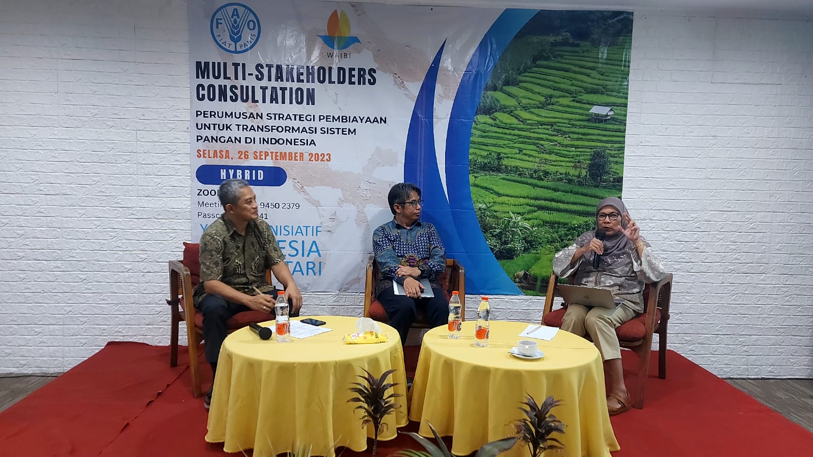 Kegiatan ini dilaksanakan pada tanggal 14 Juli 2023 di Hotel Ibis Tamarin, Jakarta dan dihadiri oleh perwakilan FAO, UNEP, World Bank Indonesia, Asian Development Bank (ADB), Kementerian PPN/ BAPPENAS, Kementerian Keuangan, Kementerian Pertanian, Kementerian Lingkungan Hidup dan Kehutanan, Badan Pangan Nasional, Bank Rakyat Indonesia (BRI), Danone Indonesia, Indonesia Business Council for Sustainable Development (IBCSD), Partnership for Indonesia’s Sustainable Agriculture (PISAgro), Yayasan KEHATI Indonesia, IPB University, Universitas Indonesia dan Yayasan Inisiatif Indonesia Biru Lestari (WAIBI).